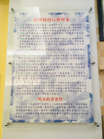 大張海報說明了按摩後的反應,疲倦、口乾、酸痛、胃口變好、手心發汗、全身流汗、尿液變色、舒服、輕鬆、好睡...等都是屬正常現象,按摩後要記得多喝水幫助排泄順暢。