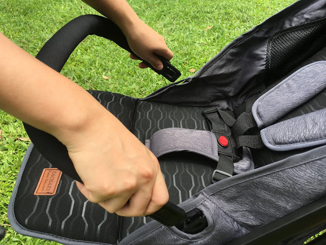 這款「Zachary 歐系高景觀嬰兒推車」,很強調單手收折的功能,讓一打一帶孩子的媽媽可以更有效率。我們按照說明書,用單手大拇指推「開關」和壓把手上的「收納按鈕」,甩一下就可以打開推車了,收折回去也是一樣要推「開關」和壓「收納按鈕」,只是方式不太一樣,需要下壓折起。