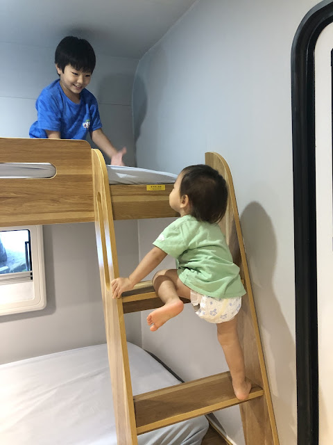 兩個小孩光是在樓梯爬上爬下就可以玩一整天,上下舖的樓梯很平穩,一歲多的弟弟也可以在大人看管下自在移動,半夜上廁所也不怕迷迷茫茫掉下床。